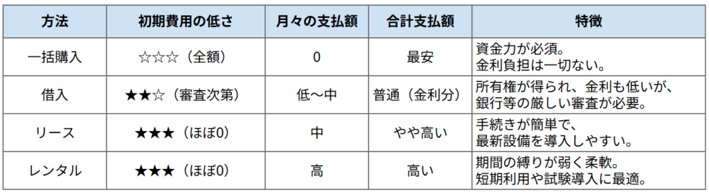 借入余力に余裕がない場合は、あえて「リース」や「レンタル」を選択し、銀行の融資枠を温存しておくのが多店舗展開を見据えた戦略と言えます。